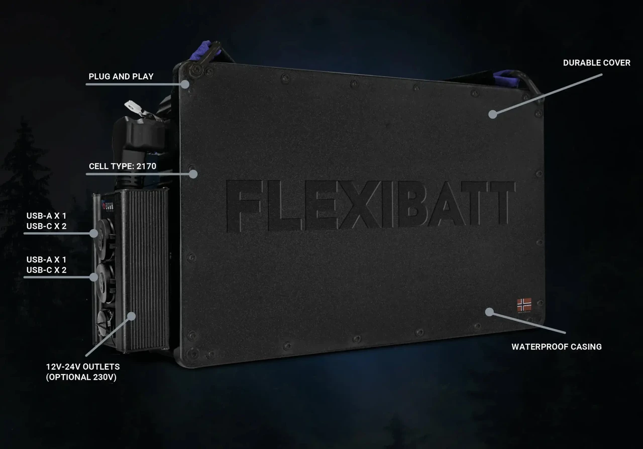 Standardselt on Flexibatt varustatud 12 V Neutrik väljundiga ning 2 × USB-A ja 2 × USB-C pesaga koguvõimsusega kuni 240 W. Seade on veekindel (IP66), löögikindel ning tagab usaldusväärse energiavarustuse seal, kus seda kõige rohkem vajatakse.